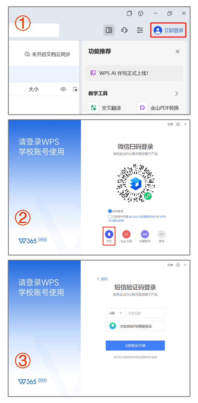 第三步:学校管理员审批通过后,使用手机+验证码的方式即可登录WPS 365教育高级版客户端进行试用。