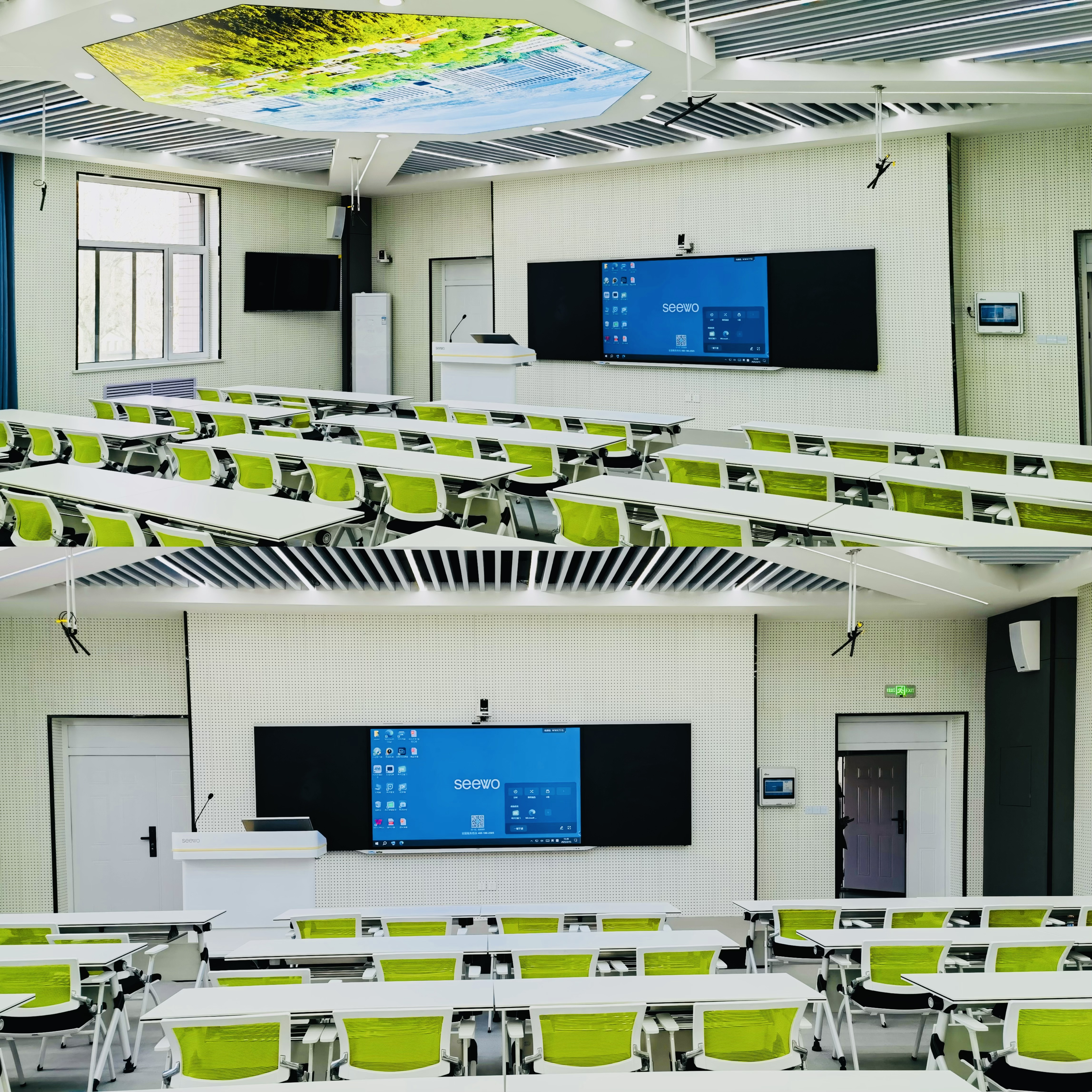 2.研讨型精品课程录播室(60人):部署“智慧研讨”管理系统,配备86吋电容双屏、智慧课堂主机、分组主机、分组屏、研讨桌椅等,满足师生开展翻转课堂、混合式学习、项目式学习、探究式学习等新型教学模式的需求。