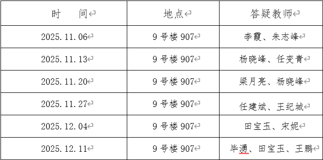 为助力大四同学备战考研,本学期数学学院大学数学教学中心统一安排数学课程(高等数学、线性代数、概率论与数理统计)答疑。答疑时间是从第10周开始,每周四下午16:00-18:00,答疑地点和教师具体安排如下: