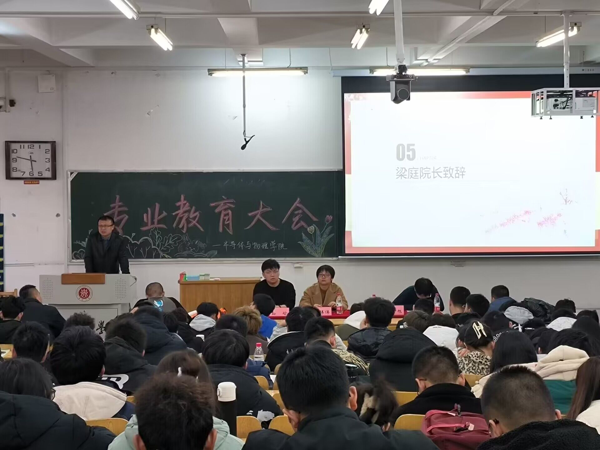 副院长梁庭老师从学科角度对学院各专业的师资队伍、教学科研、专业学习条件及学科前景等进行了详细介绍,让新同学更加了解学院,了解各专业的发展动态和发展前景,进一步激发了同学们在新学院的学习动力。本次专业教育大会是半导体与物理学院接收专业分流新生的一次见面会,也是一堂生动的思政课,为日后的学习与职业生涯都做了一个很好的引导,希望大家在校期间注重提升自身各方面的素质,不负韶华,能顺利进入社会成为国家栋梁。