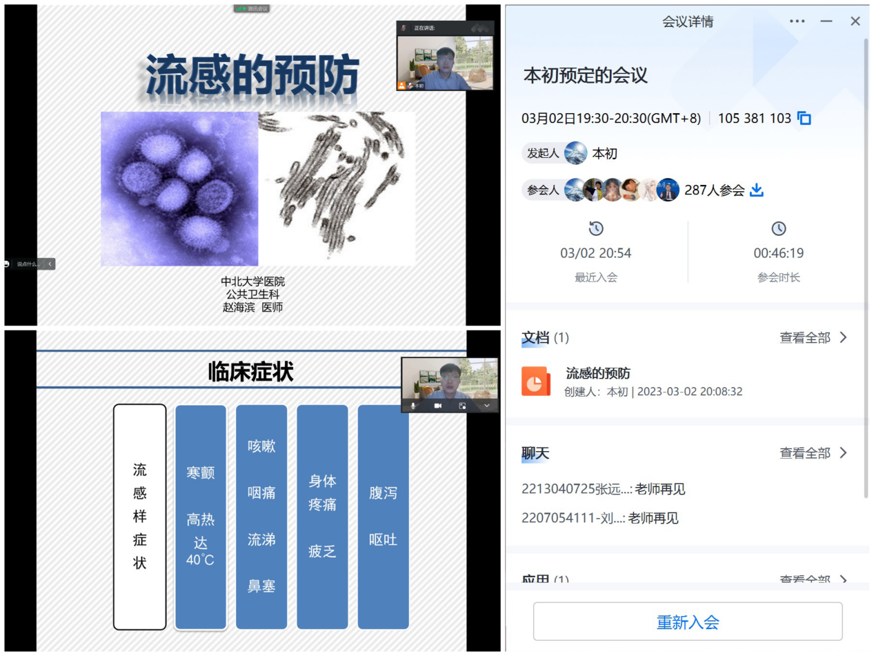 3月2日,校医院面向各学院组织开展了流感预防知识的专题线上讲座,由公卫科赵海滨医师主讲,内容主要涵盖流行性感冒的概念、流行的三环节、常见症状、预防与消毒等方面,有近300名大学生参加。