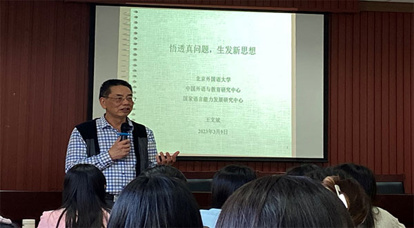 3月9日下午,北京外国语大学博士生导师、教育部高等学校英语专业教学指导分委员会副主任委员王文斌教授应邀为我院师生做了题为“悟透真问题,生发新思想”的学术报告,人文学院外语教师、研究生和部分本科生参加。报告会由人文社会科学学院院长芮燕萍教授主持。