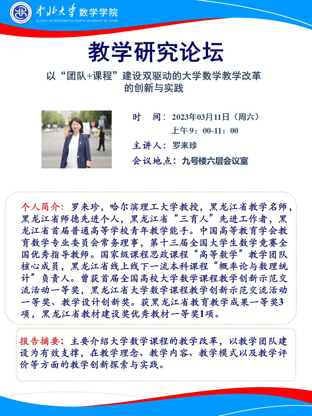 2023年3月11日上午,数学学院邀请哈尔滨理工大学罗来珍教授做了题为“以‘团队+课程’双驱动的大学数学教学改革的创新与实践”的专题报告。本次论坛在九号楼六层会议室线上线下同步进行。书记薛亚奎教授、副院长王鹏教授、副院长吴森林教授、系主任、课程负责人和部分任课教师参加了本次论坛。论坛由副院长王鹏教授主持。