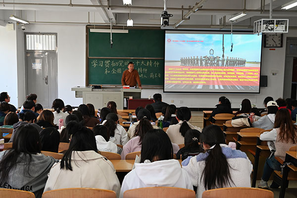 3月28日下午,人文社会科学学院邀请党的二十大精神宣讲团成员蔺玄晋副教授在15109教室主讲党的二十大精神与全国“两会”精神主题班会,学院2021级英语专业150余名同学参加。