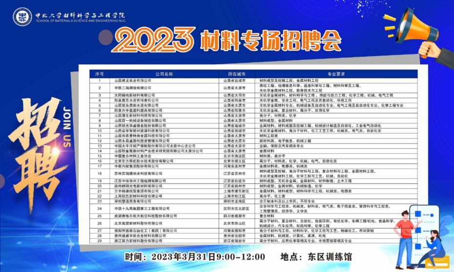 2023年3月31日上午,材料科学与工程学院2023届毕业生专场招聘会于东区训练馆成功举办。此次专场招聘会共邀请29家企业,其中省外企业15家、省内14家。校招生与就业工作部部长李博、学院党委书记廖海洪、院长王强和党委副书记郭云霞到现场与公司负责人深入交流。