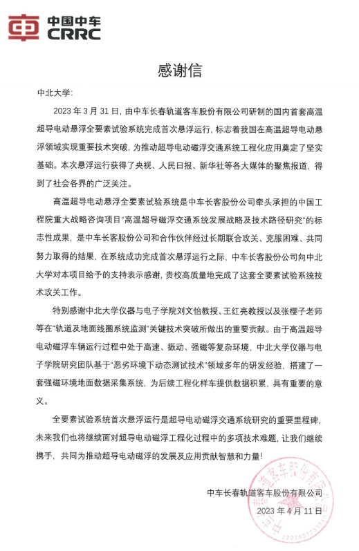 在中车长客牵头承担的中国工程院重大战略咨询项目——“高温超导磁浮交通系统发展战略及技术路径研究”中中北大学也参与其中给予了技术支持,中车长客特意发来了感谢信。中北大学仪器与电子学院刘文怡教授、王红亮教授以及张樱子老师等在“轨道及地面线圈系统监测”关键技术突破中做出了重要贡献。由于高温超导电动磁浮车辆运行过程中处于高速、振动、强磁等复杂环境,中北大学仪器与电子学院研究团队基于“恶劣环境下动态测试技术”领域多年的研发经验,搭建了一套强磁环境地面数据采集系统,为后续工程化样车提供数据积累,高质量地完成了这套全要素试验系统技术攻关工作。