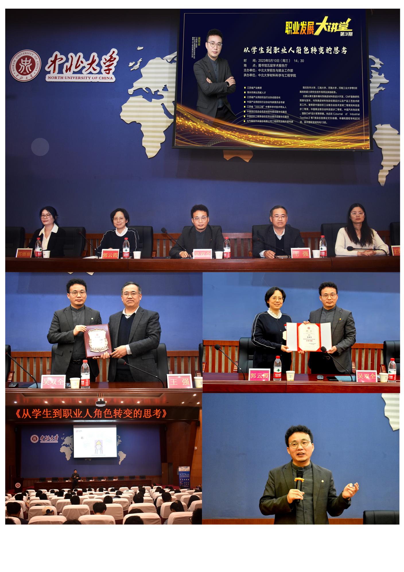 为帮助学生了解社会需求与职场要求,让学生快速向职场人转变,5月10日下午,在图书馆五层学术报告厅材料科学与工程学院承办职业发展大讲堂第三期讲座,题为《从学生到职业人角色转变的思考》。本次活动邀请到江苏省常州市旷达科技集团股份有限公司董事、总工程师兼设计总监吴双全先生担任主讲嘉宾。材料学院院长王强、院党委副书记郭云霞、旷达产品开发工程部部长郭丽丽、旷达科创中心负责人王晓敏及200余名学生一起聆听了此次讲座。