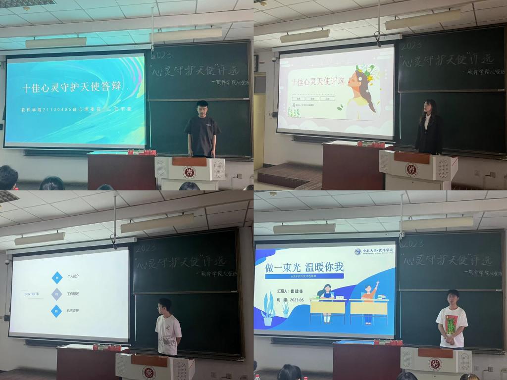 参选的心理骨干从自我介绍、工作回顾、感想收获等方面利用幻灯片图文并茂的向各位评委和在场同学进行展示,使同学们对心理联络员这个普通的班委身份有了更全面更深层次的的认识。经过激烈角逐,来自21130430班的樊佳怡等十名同学荣获软件学院2023年“十佳心灵守护天使”称号,心理站21130428班杨恺萱同学、21130404班张琪同学获得优秀工作者称号。