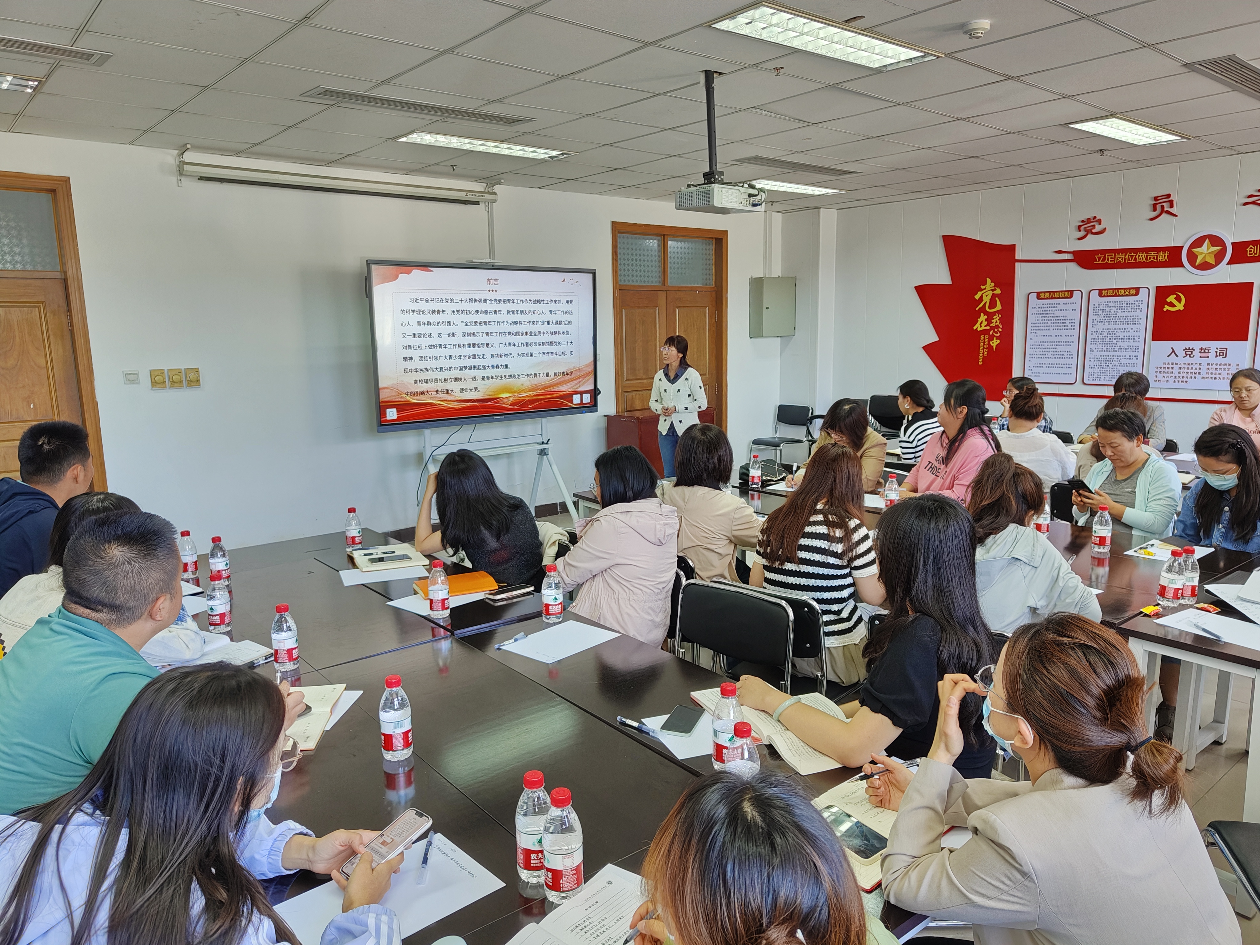 在理论学习环节,电气与控制工程学院党委副书记杜苇老师以“学习贯彻党的二十大精神、做青年学生的引路人”为主题进行了领学。她通过分析做好青年工作的战略意义指出了开展青年工作所遵循的三个坚持,即坚持党的领导,必须促进青年发展的政治方向;坚持胸怀“国之大者”,将青年发展统一于国家发展之中;坚持青年为本,充分尊重青年自身发展诉求。高校辅导员要成为坚定理想信念的育人者,具备扎实学识的指导者,满怀仁爱之心的陪伴者,高尚道德情操的示范者。同时杜苇老师结合自身带班过程中丰富的工作案例讲解了如何做好青年学生的思想引领工作,通过深入浅出的案例分享使在场各位辅导员们感受颇深,收获颇丰。