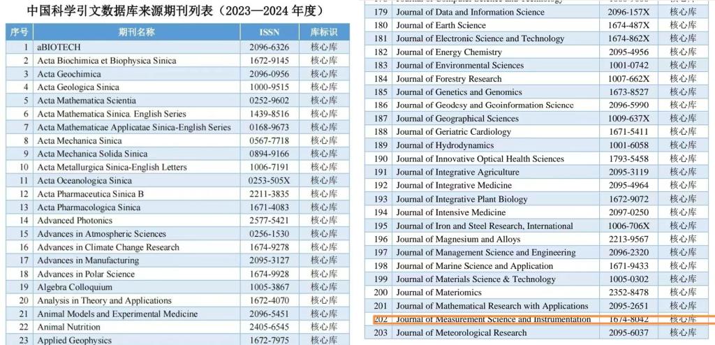 CSCD是我国重要的引文数据库之一,与SCI在同一平台面向全球提供学术服务,其每两年对我国出版的中英文期刊进行定量遴选和定性评估,2023-2024年度收录核心期刊1339种。
