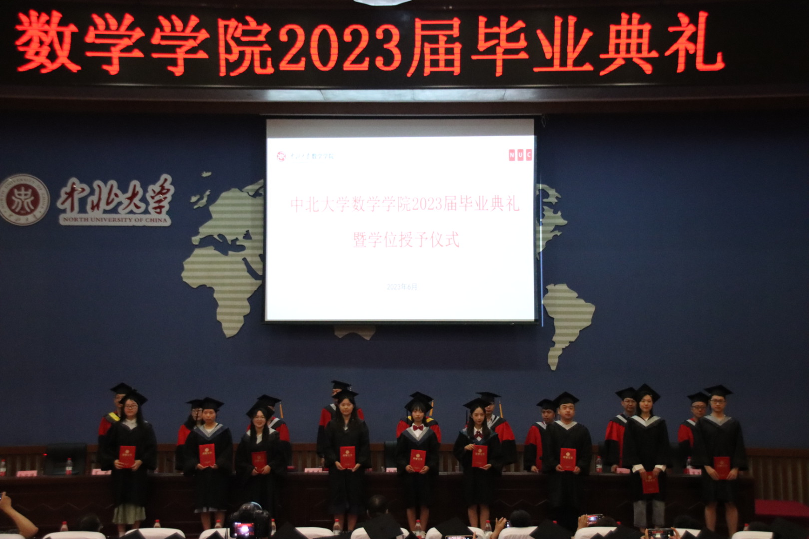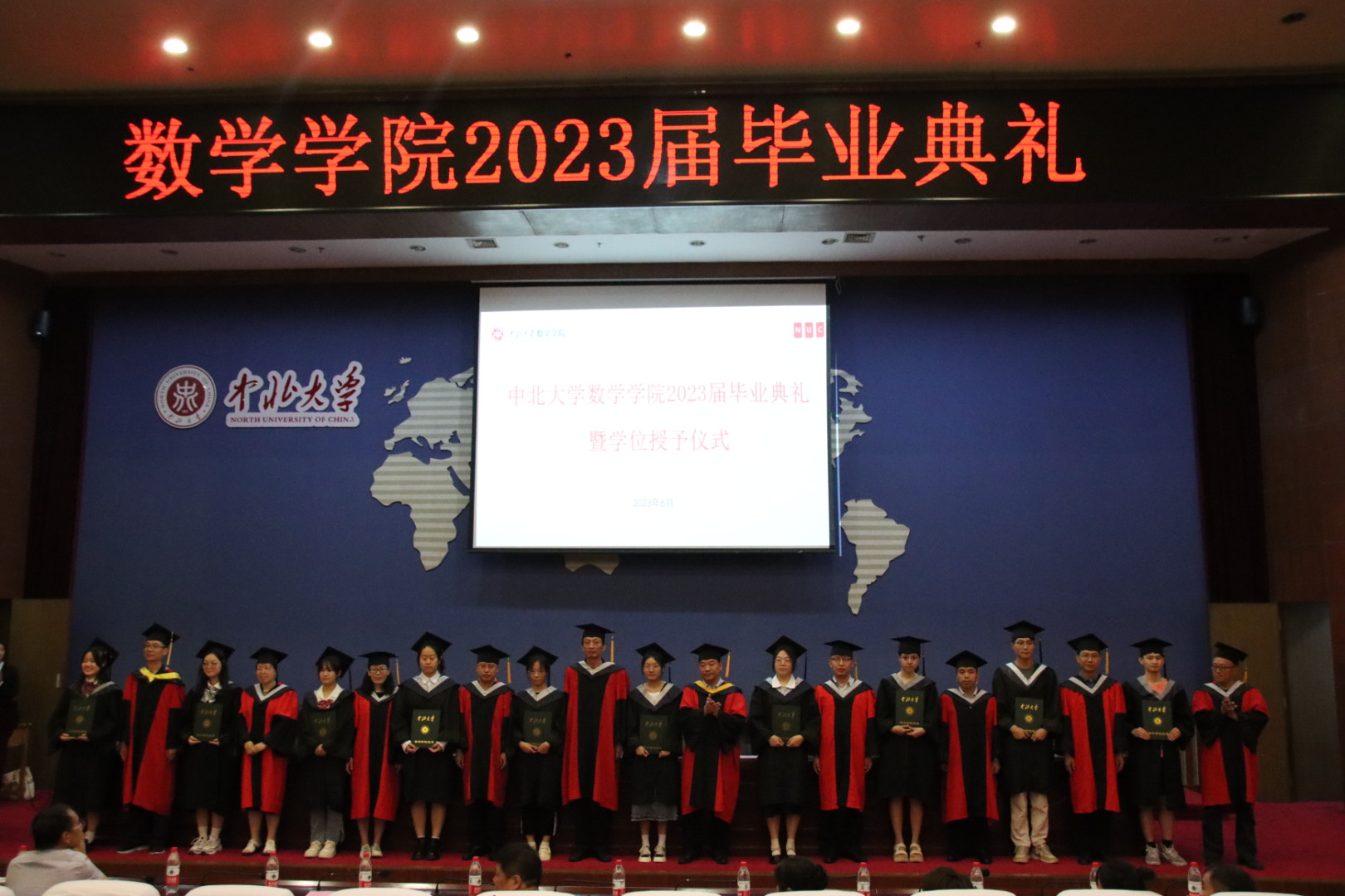 典礼在庄严的国歌中正式拉开序幕,院党委书记薛亚奎宣读优秀毕业生名单,主席台各位领导为中北大学优秀毕业生和数学学院优秀毕业生颁发证书。