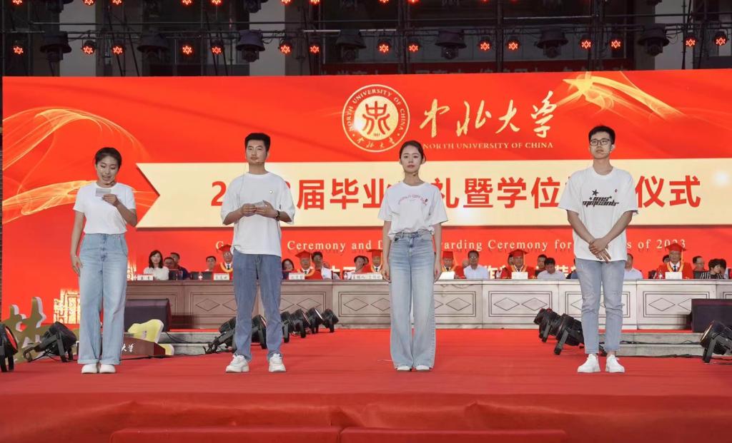 校党委副书记曾建潮教授宣读《中北大学关于表彰2023届优秀毕业生的决定》,副校长赵贵哲教授宣读《中北大学关于拟授予2022届毕业生学位的决定》,大会举行了隆重优秀毕业生颁奖仪式、学位授予仪式和研究生支教团授旗仪式。主席台领导和嘉宾为2023届优秀毕业生代表颁奖;校党委书记沈兴全教授为博士毕业生代表正冠拨苏、颁发学位证书并合影留念,全体校领导为硕士、本科毕业生代表正冠拨苏、颁发学位证书并合影留念;校党委书记沈兴全为研究生支教团授旗。天涯有尽处、师恩无穷期,典礼上,毕业生代表们分别向学校教育教学一线的教师、辅导员以及后勤、校医院、保卫处等服务保障部门的教职员工献花致敬,并现场号召现场所有同学向辛勤付出的全体教职员工鞠躬致谢。