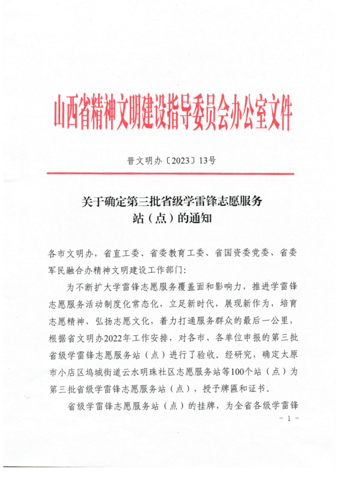 近日,山西省文明办下发《关于确定第三批省级学雷锋志愿服务站(点)的通知》(晋文明办〔2023〕13号),确定第三批省级学雷锋志愿服务站(点),我校学雷锋志愿服务站成功入选。