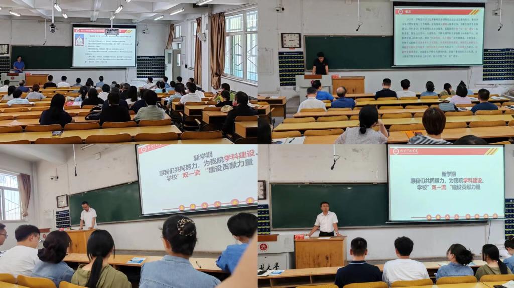 随后李京阳院长从建院来的工作业绩和下半年的工作计划两个部分,分别从学院党建、科研、人才引进、学科建设、教育教学及百亿工程等多方面介绍了学院的发展情况,其中有令人欣喜的成绩,也有亟待补足的短板,激励老师们扬长补短,明确各自的目标,取得新的更大的成绩!徐鹏副院长从基金申报、在校研究生培养、2024研究生培养方案制定、本科教学工作、学科评估工作的要求和启动五个方面对工作进行了相应的安排。接着史瑞根副书记从学生工作日常情况、学生导师配备、就业育人项目、本科生招生宣传、学生参加大赛、学生就业、学生学业预警七个方面对学生工作进行了相应的汇报和安排。并对学院工会工作的成效、工会后续工作安排进行了汇报。