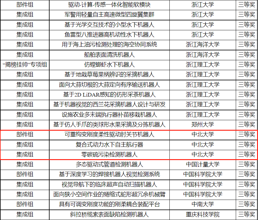 2023年8月16日至8月20日,“申昊杯”第五届中国研究生机器人创新大赛在湖南大学举办,我校经校级评审向组委会推荐的机器人作品经全国初评、决赛环节,最终“可重构变刚度柔性驱动肘关节机器人”获得部件组三等奖;“复合式动力水下自主航行器”获得集成组三等奖;“零碳硫污染检测机器人”获得集成组三等奖。