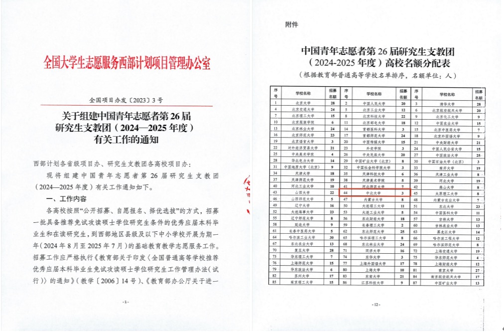 近日,全国大学生志愿服务西部计划项目管理办公室发布了《关于组建中国青年志愿者第26届研究生支教团(2024—2025年度)有关工作的通知》,我校正式入选第26届研究生支教团全国指标分配范围,2023年将由教育部专项下拨3名指标,实现了我校研究生支教团工作的新突破。