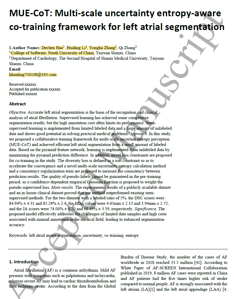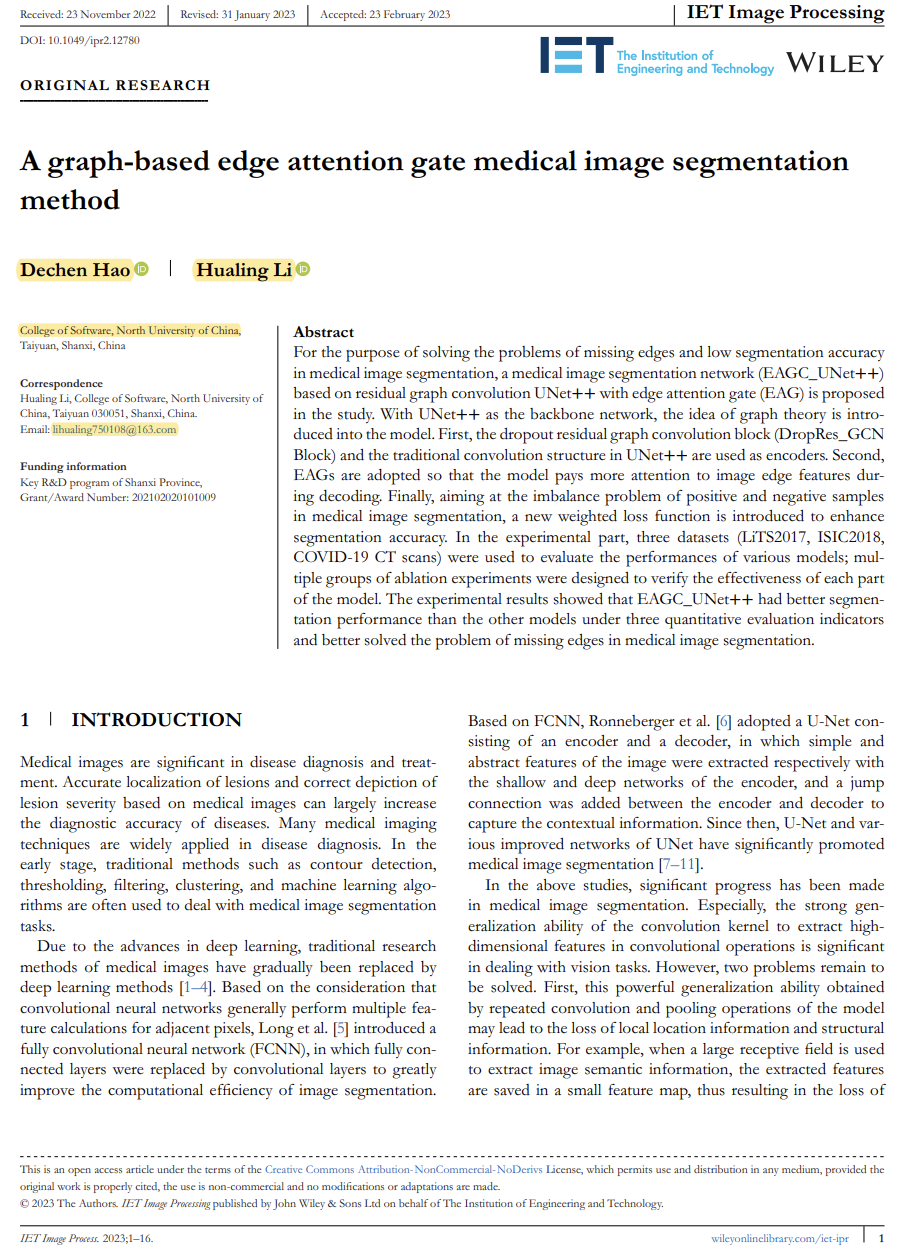 软件学院研究生郝德琛所在的李华玲副教授团队,目前正在承担山西省科技厅重大专项,在承担此项目的过程中,与山大一院、山大二院和太原市中心医院进行了非常深入的合作。由研究生郝德琛为第一作者、导师李华玲为通讯作者的论文“A graph-based edge attention gate medical image segmentation method”于2023年3月在《IET IMAGE PROCESSING》期刊发表。该研究成果发表后立即受到了全球学者们的广泛关注,在发表后的三个月内即获得了320次下载,位居该期刊中国作者第一季度发表文章三月内下载量前五,因此荣获2023年第一季度“Wiley中国开放科学高贡献作者”荣誉,这是我院研究生和老师首次获得此奖项。