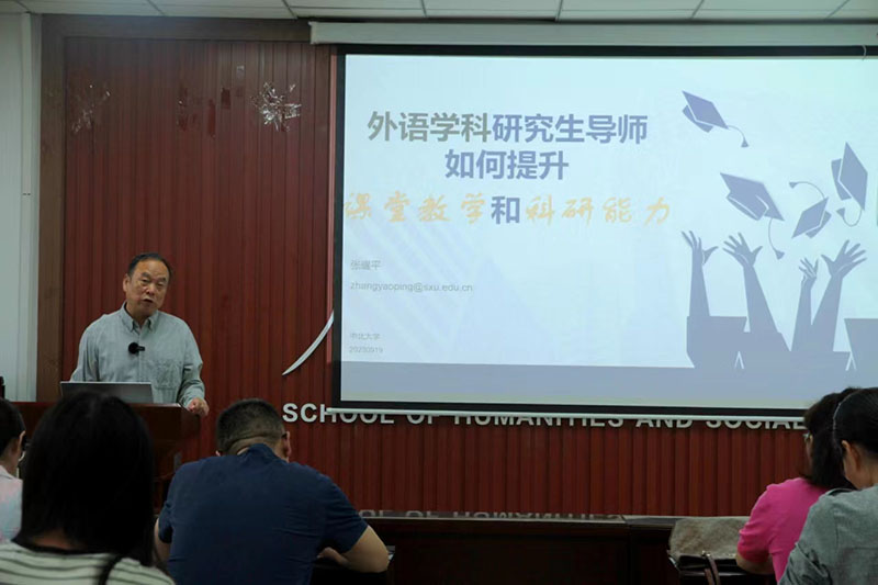 为切实加强研究生导师队伍和学科队伍建设,全面落实中北大学研究生院《关于开展研究生导师培训工作的通知》要求,9月19日下午我院邀请山西大学外国语学院院长张耀平教授为我院师生进行学术讲座,题目为“外语学科研究生导师如何提升课堂教学和科研能力”。学院院长芮燕萍教授主持,全体硕导、研究生、学术骨干参加。