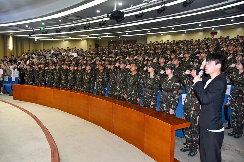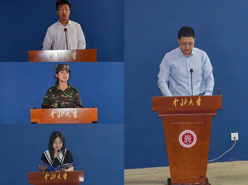 雄壮的国歌声后,秦品乐院长在表达对全体新生热烈欢迎的同时从历史沿革、教职工构成、专业发展、科研方向、育人目标等方面介绍了学院情况,在此基础上,他寄语新生:希望同学们立大志、练真功、勇担当,书写无悔青春。接下来,本科生新生代表曹若雯、研究生新生代表乔哲瑞依次上台发言,他们畅谈了对新生活的憧憬和向往。之后,在校生代表张雅结合自己的学习、生活经验为学弟学妹们指点迷津。教师代表于海波老师勉励新生奋发图强,同时代表全院教师做出庄严承诺:爱岗敬业、为人师表,真诚关爱每一位学生。铭记老师的期许,在研究生代表李振堂同学的带领下,新生宣誓道出了他们对未来的铮铮誓言与奋斗不止的坚强决心。最后,院党委书记喻华兵总结发言:他从“为何而读书”出发,勉励新生要牢记习近平总书记的嘱托,以“为强国建设、民族复兴而读书”为己任,在大学学好“规划课”,科学管理时间,勤奋学习、努力攀登;学好“专业课”,研究真问题,解决真问题;学好“实践课”,在实践中学真知、悟真理、长才干,他也希望同学们见贤思齐,与优秀的人同行,不负青春,不负韶华!