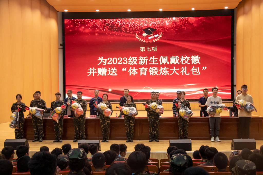 为了让每一位新生在能动大家庭里找到归属感,主席台领导为新生代表佩戴了校徽,所有在场新生为自己佩戴了校徽。从校徽带上的那一刻起,“中北人”就成了大家共同的名字,“中北大学”将成为同学们一生的印记。同时,为鼓励新生加强体育锻炼、提高身体素质,学院还为每一个新生班级准备了篮球、羽毛球、乒乓球、跳绳等“体育锻炼大礼包”,号召广大同学走出宿舍,走进操场,锻炼身体。