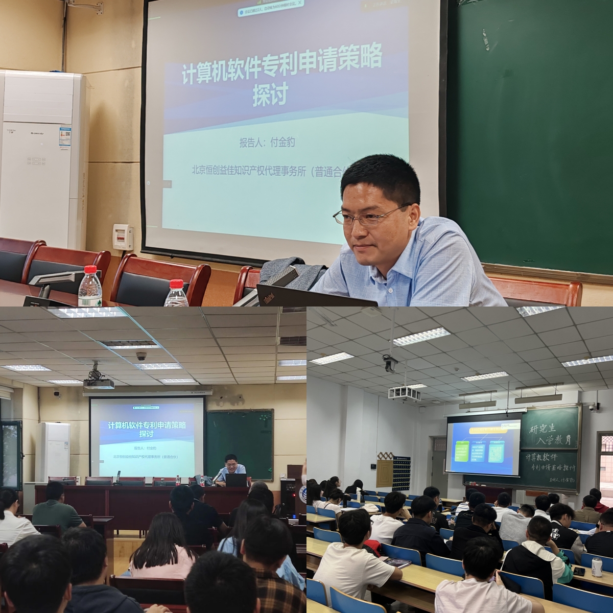 付老师围绕计算机软件领域专利申请有关问题与同学们进行了探讨和学习。他从计算机软件适合申请的专利类型、计算机软件如何申请专利展开介绍,然后详细讲解了撰写原则、专利文件的组成,重点介绍了说明书撰写的注意事项和常见问题,对提高创新性强调了三点意见。