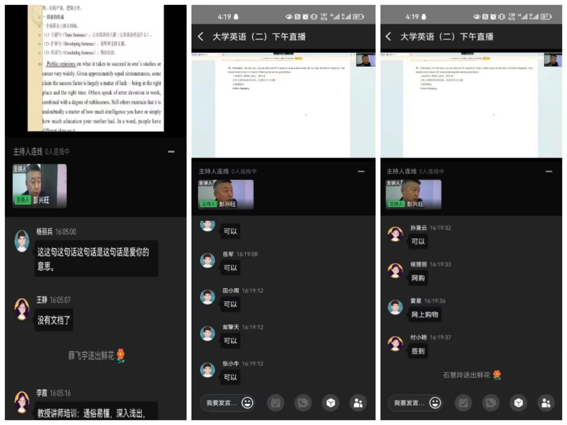 为做好此次线下线上同步直播教学工作,我校提前精心筹备,积极组织。为确保此次近8000多人的教学工作,学院与技术支持积极沟通,提前测试,多方配合保证了学生线上线下全过程顺利进行,彭老师授课前充分考虑到学生的认知水平、课堂需要、疑点与兴趣,精心设计了整个教学过程,从而减少上课盲目性,并且根据学生的兴趣倾向和认知特点因材施教,合理调整教学顺序,课前及时向学生发放学习资料,为集中面授创造良好的教学环境。彭老师还利用多媒体将“学-教-练”贯穿于整个课堂,利用图像,声音,视频影像等教学形式,将难解的理论知识消化吸收。老师宽广的知识面,旁征博引的将写作要解决的4大问题清晰明了的讲解清楚。授课风格活泼生动,讲课资料紧凑丰富,十分有利于同学们在较短时刻内掌握课堂资料。加上课堂互动,调动学生课堂积极性和主动性,一问一答,一思一解中高效完成教学活动,课堂学习氛围浓厚。