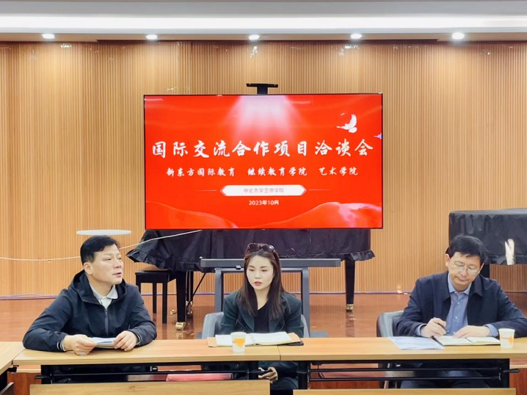 2023年10月24日,艺术学院、继续教育学院与太原新东方国际教育培训中心就语言培训、国外升学等议题开展合作项目洽谈。太原新东方国际教育培训中心主任魏晓红,继续教育学院院长郝晓东,艺术学院党委书记郭云霞、院长王燕平、党委副书记田维飞、副院长李仁伟以及各系主任出席洽谈会。