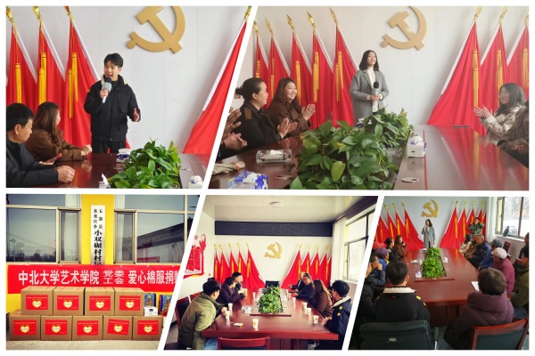 为了进一步巩固学习贯彻习近平新时代中国特色社会主义思想主题教育的学习成效,助力乡村振兴,11月15日中北大学艺术学院党委及院工会开展“艺心为民暖冬行”暨文化艺术下乡活动。学院党委书记郭云霞、副书记田维飞、工会主席陆晨曦、音乐系曹艺老师及2名艺术志愿者驱车三个多小时,到达忻州市五寨县东秀庄乡小双碾村和狮子沟新村,看望我校在两村工作队的一线老师们,同时为当地村民们送去学院师生们捐赠的9箱棉衣和军训服,捐赠仪式在小双碾村进行。郭书记代表中北大学艺术学院将师生们捐赠的物品交付驻村工作队,并表达了艺术学院师生关心支持“乡村振兴”事业,愿为乡村百姓作贡献的心声。