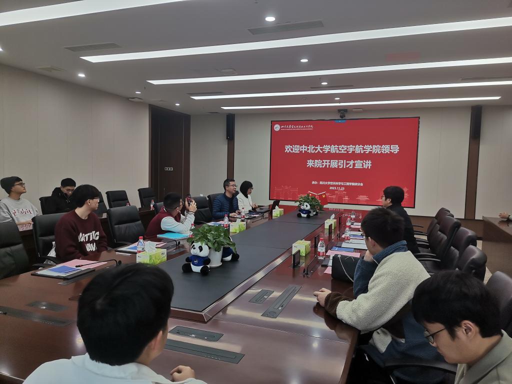在四川大学空天科学与工程学院考察调研时,学院党委书记高志华对我院一行表示了热烈欢迎,黄崇湘副院长介绍了空天科学与工程学院的发展历程、师资队伍、人才培养、科学研究、学科建设方向等,我院李京阳院长介绍了学院建院以来的发展情况等。交流会上,双方表示希望以此次调研为契机,今后建立更加紧密的联系,在相互学习和借鉴中共同促进学院高质量发展。调研会后,李京阳院长分别对空天科学与工程学院的博士生进行了招聘宣讲。