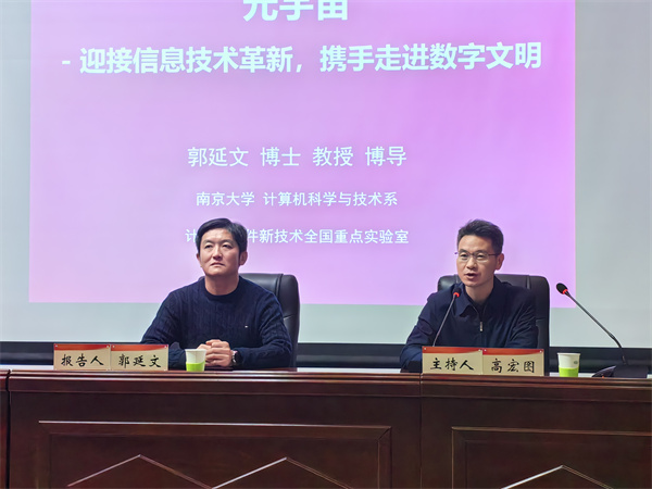 11月24日晚上19:30,由学生工作部(研究生工作部、武装部)主办、软件学院承办的中北大讲堂在瑾瑜国际会议中心学术报告厅顺利举办。本次中北大讲堂特别邀请南京大学教授、博导郭延文为我校师生带来主题为“元宇宙:迎接信息技术革新,携手走进数字文明”的精彩报告。学院党委副书记高宏图主持报告。