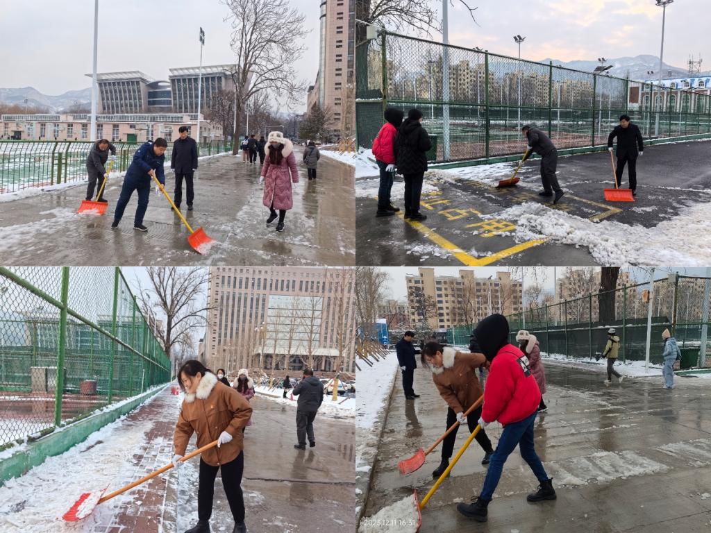 活动由李博部长负责组织,并给部内教职员工部署教学11号楼、行知广场两侧及地下通道入口两侧等相关任务。大家纷纷行动、积极参与,戴上手套,握紧铁锹,不畏冷风,认真地清扫校园道路上的积雪。虽然天气寒冷,但并没有阻挡住大家的热情,大家齐心协力,干得热火朝天。