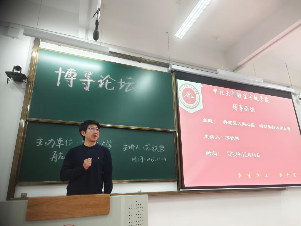 2023年12月14日下午,航空宇航学院在17405H举办了一场别开生面的博导论坛。做客本次论坛的是中北大学副校长苏铁熊教授,他为航空宇航学院全体2023级学生做了主题为'共画最大同心圆,规划美好大学生活'的讲座。参加论坛的还有院长李京阳教授,科长张丽花老师,辅导员李国平老师。