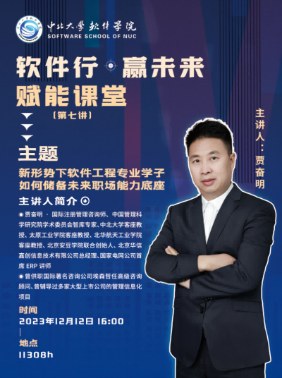 为了帮助在校大学生更加充分地认识到软件工程专业的优势,同时激发大家的就业紧迫感,树立危机意识和竞争意识,指导同学们如何储备未来职场能力底座,强化职业规划意识,更好地为适应未来职场奠定扎实的基础,12月12日下午,软件学院在11308H教室举办了“软件行·赢未来”赋能课堂第七讲——新形势下软件工程专业学子如何储备未来职场能力底座。本次课堂特别邀请到原华北工学院校友、中国管理科学院学术委员会智库专家、国际注册管理咨询师、北京华信嘉创信息技术有限公司总经理贾奋明担任主讲,我院2022级、2023级300余名学生现场聆听。学院党委副书记高宏图主持讲座,就业辅导员乞国钰参加活动。