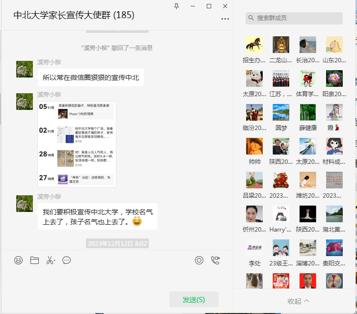 为进一步加强本科招生宣传工作,探索招生宣传的新方式、新途径,2023级新生开学季,我校面向学生家长征集组建了180余人“中北大学家长招生宣传大使”微信群,与家长形成了良好互动。招生办公室及时转发学校的重大新闻与学生成长的相关动态,家长也对学校的发展与宣传工作提供了很好的意见和建议,家长通过微信群、朋友圈、抖音等途径转发学校的宣传内容,形成了家长与学校联动的招生宣传新格局。