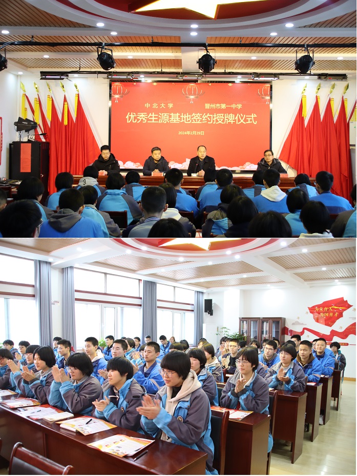 宋旭东副部长向晋州一中师生介绍了中北大学的基本情况和部分在中北就读学生的学习和成长情况,他希望进一步加强沟通与交流,过多平台、多渠道、多形式开展合作,吸引更多晋州一中的优秀学生到中北大学读书深造,随后进行了“优秀生源基地”协议的签订与授牌仪式。