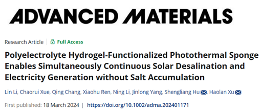 近日,我校能源与动力工程学院胡胜亮教授团队在国际著名期刊Advanced Materials上发表题为“Polyelectrolyte Hydrogel-Functionalized Photothermal Sponge Enables Simultaneously Continuous Solar Desalination and Electricity Generation without Salt Accumulation”的论文。中北大学为第一署名单位,硕士研究生李林为第一作者,胡胜亮教授为通讯作者,南澳大学徐浩兰教授为共同通讯作者。