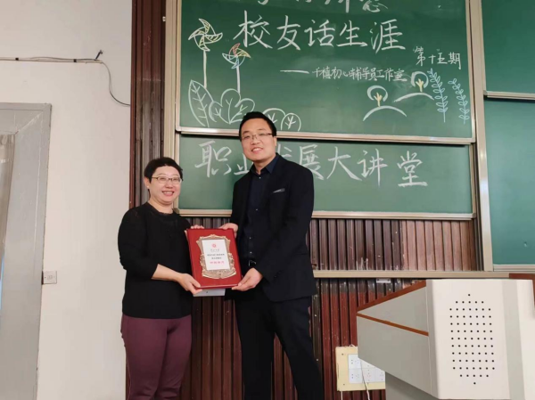 会后,李秀玲老师为常刚刚学长颁发了“中北大学职业发展与就业创业特聘导师”讲牌,希望常刚刚学长能以专业的水准持续为我院学生提供生涯指导。
