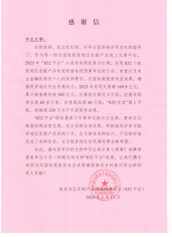 为积极响应党中央号召,落实国家消费帮扶政策,巩固拓展脱贫攻坚成果,努力推进乡村振兴工作。后勤管理部在脱贫地区农副产品网络销售平台(832平台)购买所需的饮食物资,做到质量把关,价格公道。2023年,物流配送中心在832平台共完成交易总额达到200余万元,832平台对我校支持脱贫地区乡村振兴工作表示衷心感谢,并发来感谢信!