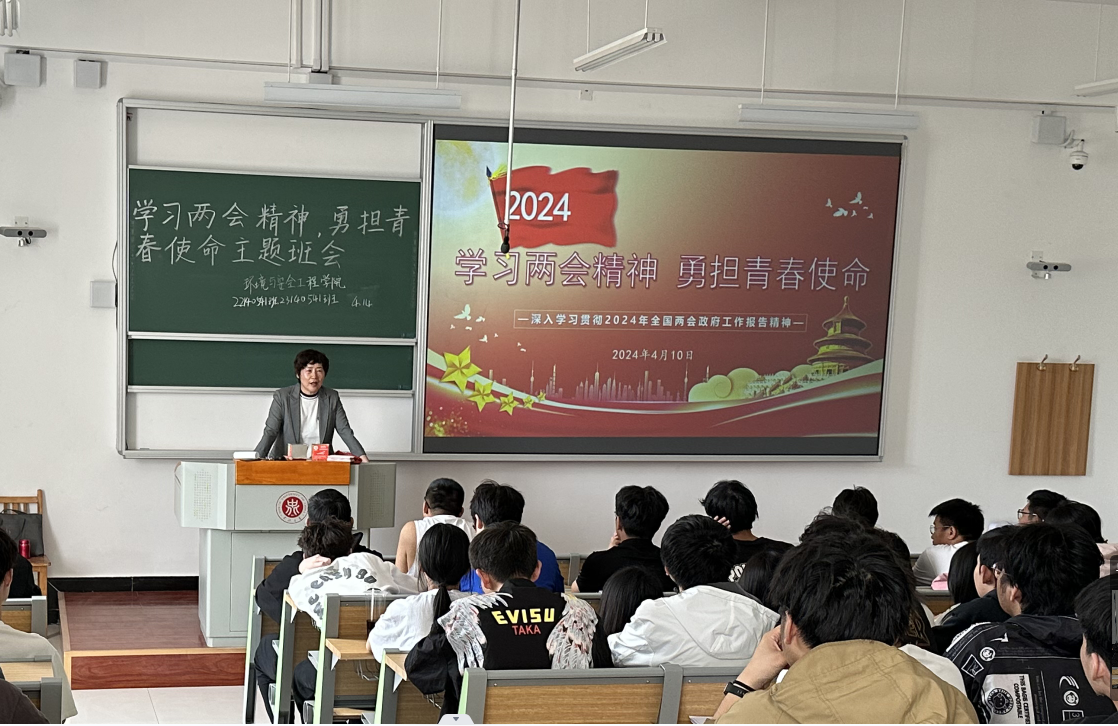 2024年4月14日,环境与安全工程学院特邀校党委常委、统战部部长夏瑞丽出席“学习两会精神,勇担青春使命”主题班会,并作精彩演讲。22140541班、23140541班班主任和全体学生参加。
