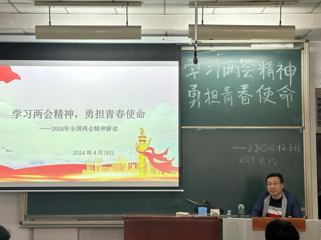 马东旭副部长深刻分析了国际国内局势,就政府报告中“加快发展新质生产力、加强科技创新、全面提升新兴领域战略能力”等做出了详细解读,引导学生积极关注祖国的建设成就,时刻关心国家发展大事,提高个人的思想觉悟,树立信心,学会担当,努力奋进,不负春光韶华,厚植家国情怀,成为立大志、担大任、明大德、成大才的时代新人。