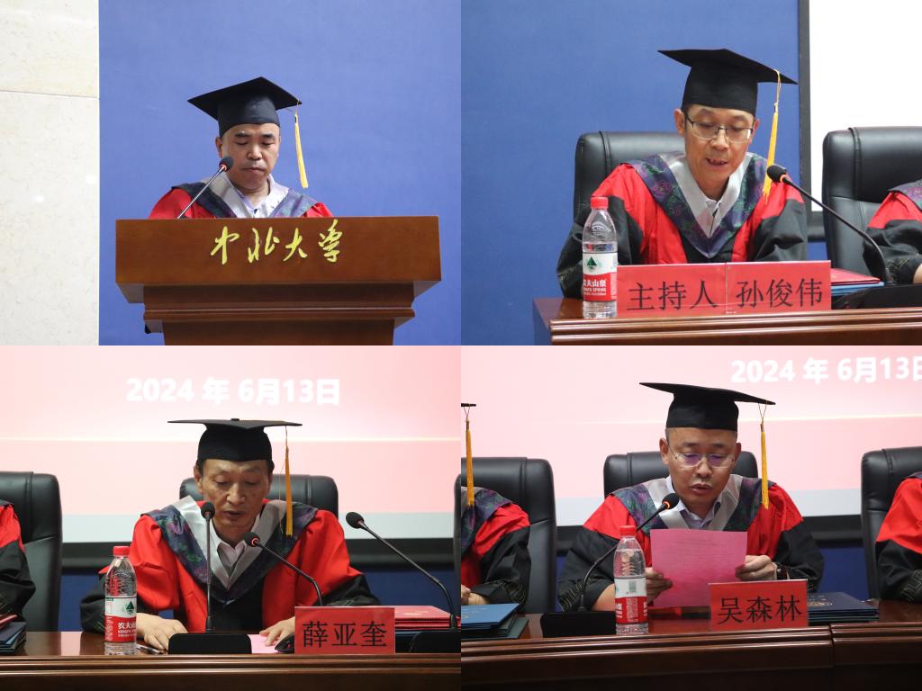 副院长王鹏教授介绍我院学士学位拟授予情况,副院长吴森林教授介绍我院硕士学位拟授予情况。院党委书记薛亚奎及院领导和系主任为全体毕业生授予学位证书、拨穗正冠并合影留念。