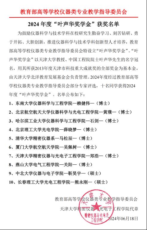 近日,2024年度“叶声华奖学金”评选结果揭晓,我校仪器与电子学院仪器科学与技术学科21级硕士研究生靳昊宇获此殊荣!共有10名来自全国不同高校的学生荣获此奖项,其中仅有2名硕士研究生!