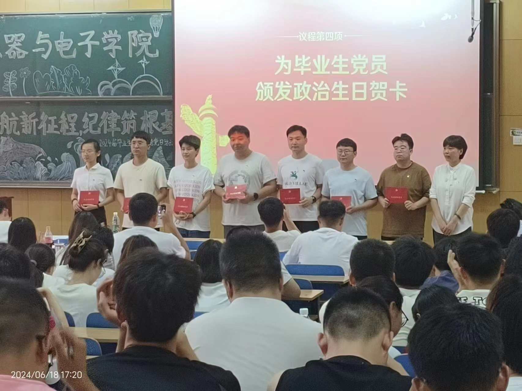 为深入开展党纪学习教育活动,鼓励和引导毕业生党员系好人生第一粒扣子,行稳致远走好人生道路,仪器与电子学院于6月18日下午,在11208H教室举办了“扬帆启征程 纪律筑根基”——2024届毕业生党员主题党日活动。学院全体毕业生党员齐聚一堂,庄重而热烈地度过在校期间最后一次党日活动。