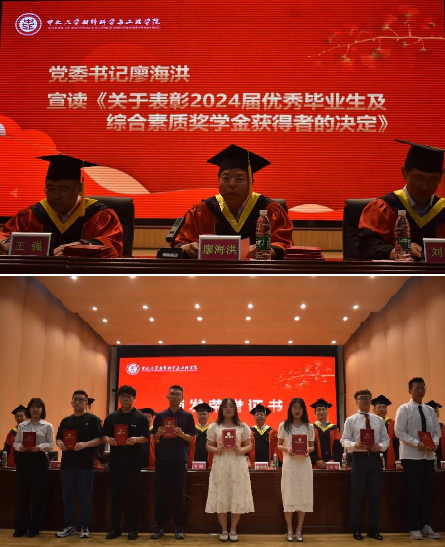 典礼在庄严的国歌声中拉开序幕。院党委书记廖海洪宣读《关于表彰2024届优秀毕业生及综合素质奖学金获得者的决定》,主席台嘉宾为获奖者颁发荣誉证书。