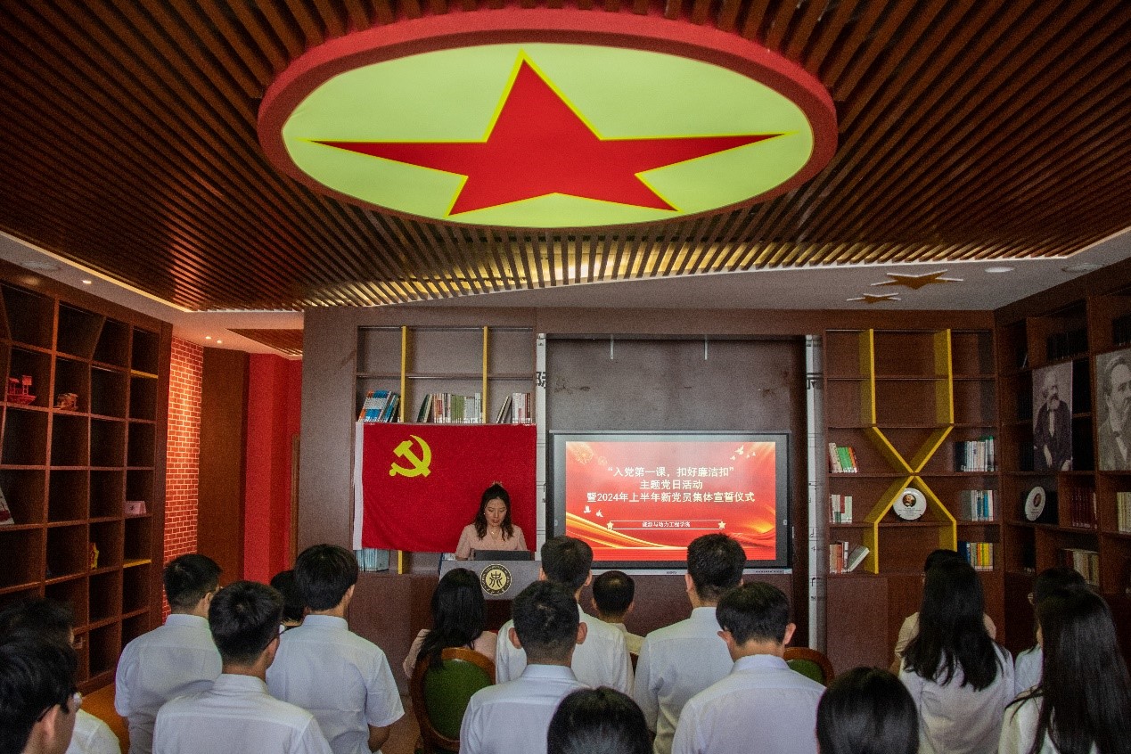 为庆祝建党103周年、喜迎建国75周年,进一步增强大学生党员的廉洁自律意识,上好入党第一课,能源与动力工程学院党委、头雁领航辅导员工作室于2024年7月1日下午,在校图书馆马克思书屋联合开展“入党第一课,扣好廉洁扣”主题党日活动暨2024年预备党员集体入党宣誓仪式。院党委书记胡向明、各学生党支部书记、本学期新发展的23名预备党员参加了本次主题党日活动,活动由院党委副书记任雁主持。
