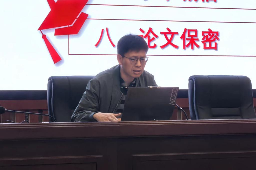 “研”途启航篇:科研科科长郑志华介绍了研究生培养流程,包括研究生教育阶段涉及课程考核、学位论文撰写等环节的具体要求,并着重强调了学术诚信及论文保密的重要性。