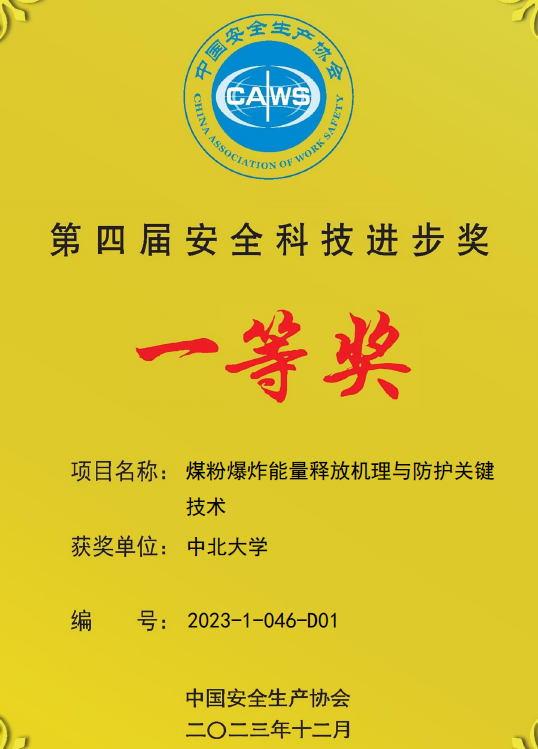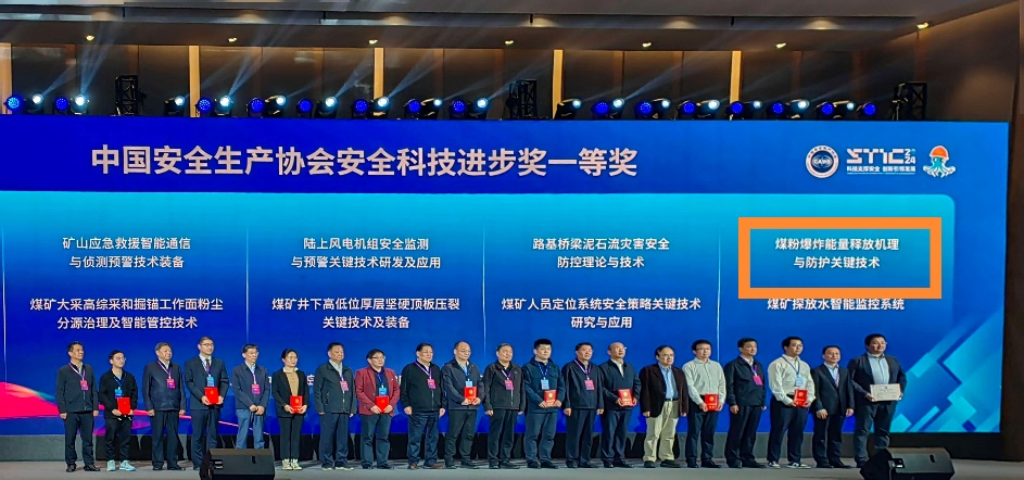 2024年10月24日,中国安全生产协会在青岛召开安全科技创新大会,中北大学安全科学与工程学科曹卫国教授团队主持完成的“煤粉爆炸能量释放机理与防护关键技术”项目荣获第四届安全科技进步奖一等奖。该奖项是经国家科学技术奖励办公室批准设立的安全生产领域唯一全国性的安全科技奖项,标志着我校安全科学与工程学科建设的又一次突破。