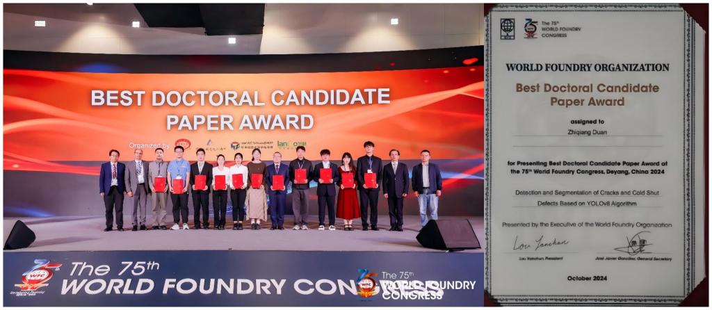 我校材料科学与工程学院教育部共建铝镁材料研发应用协同创新中心赵宇宏教授团队10名师生应邀参会并做邀请报告。其中,博士生段志强的报告“Detection and segmentation of cracks and cold shut defects based on YOLOv8 algorithm”荣获第75届世界铸造大会最佳博士生论文奖。