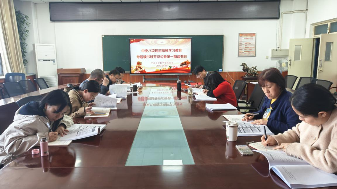 为进一步巩固拓展作风建设成果,推动中央八项规定精神学习教育落地生根,数学学院党委于4月8日下午在9号楼六层会议室举办了深入贯彻落实中央八项规定精神学习教育读书班。此次读书班旨在通过系统学习和深入研讨,引导全体党员干部深刻领会中央八项规定精神的核心要义,切实增强纪律意识和规矩意识。院党委书记薛亚奎主持,领导班子成员、党委委员、党支部书记参加。