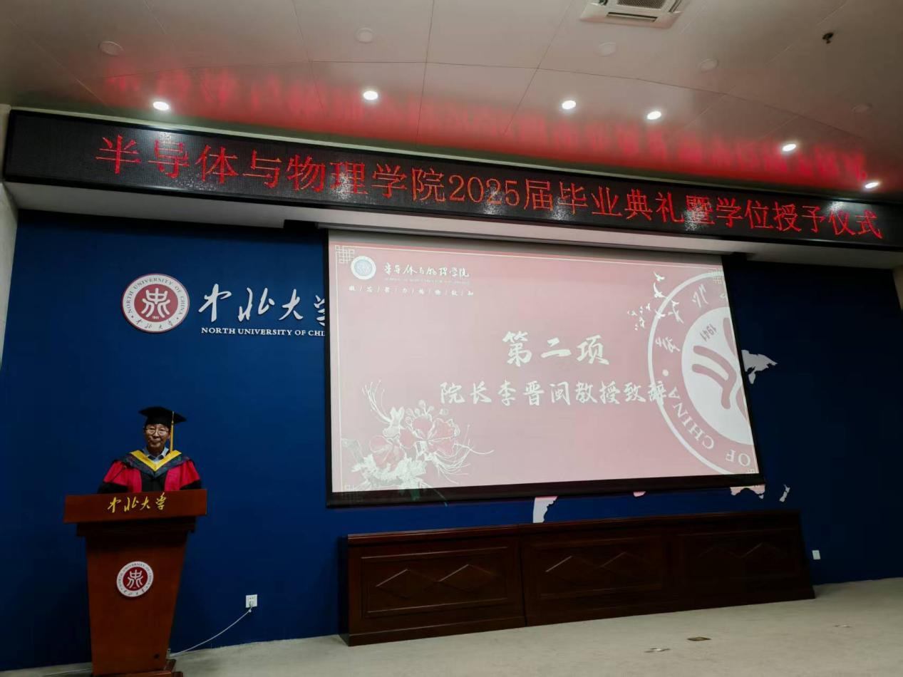 大会在庄严的国歌中拉开帷幕,半导体与物理学院院长李晋闽登台致辞,向圆满完成学业的毕业生致以热烈祝贺,寄语大家秉持学院精神,以所学回馈家国,让青春在奋斗中熠熠生辉。